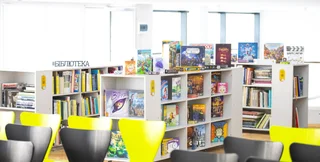 КГГА также разместила фотографии помещения, где устроили библиотеку игр. Видно, что это отремонтированная меблированная светлая комната с полочками, заставленными яркими коробками.