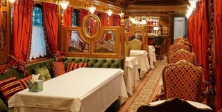 Журналисты узнали, что помещение сделали сотни украинских мастеров, дизайнеры просто "одолжили" эскизы у люксовой марки Pullman. Внутри вагона много позолоты, красного бархата и белых скатертей. Нашли там и позолоченный герб Российской Федерации.