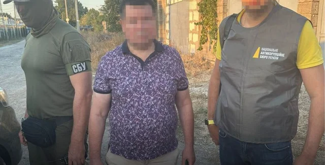 Чиновника задержали в момент получения в момент получения взятки. На фотографиях, сделанных на месте событий, видно фигурант — мужчина среднего возраста стоит между работниками СБУ и НАБУ.