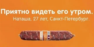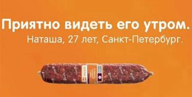 Например, надпись над палкой копченой колбасы гласит: "Приятно видеть его утром. Наташа, 27 лет, Санкт-Петербург".