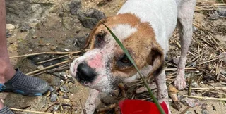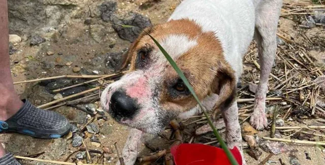 Пес Боня сразу после спасения
