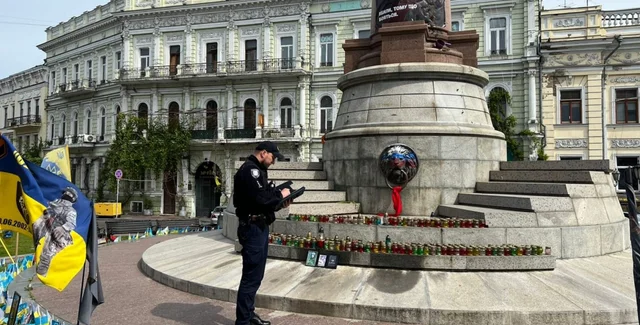 В Одессе на Европейской площади постамент, где ранее стоял памятник российской императрице Екатерине II, зарисовали красками, похожими на флаг РФ. Сейчас инцидентом занялись правоохранители.