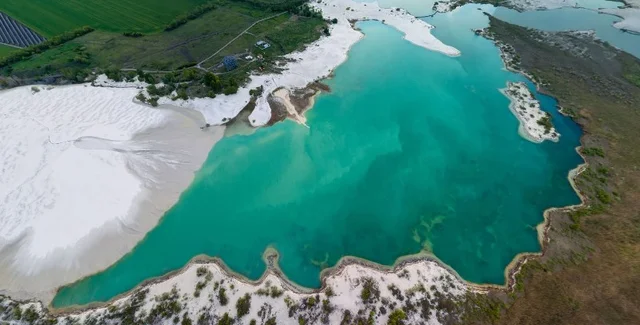 Этот карьер — чудо человеческой промышленности. Он появился в процессе добычи титано-циркониевых песков. Искусственные карьеры заполнила чистая вода из подземных источников. Ее цвет кажется бирюзовым из-за песка на дне. Он приобрел такой цвет после промышленной обработки.
