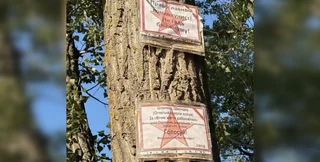 На обнародованных в соцсетях кадрах люди спрашивают у адептов так называемого коммунистическо-православного движения, зачем те расклеили на деревьях плакаты с красной звездой, а не гербом Украины. Видео опубликовал в TikTok пользователь ivan1659.