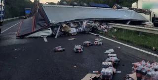 На автодороге М-05 Киев-Одесса произошло ДТП с участием грузовика с полуприцепом, перевозившего напитки. Причиной инцидента стало разрывание колеса, в результате чего транспортное средство столкнулось с отбойником и перевернулось.