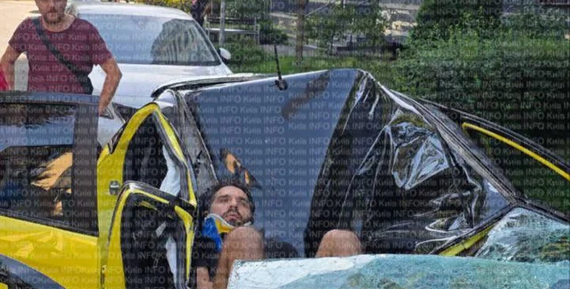 На фото можно увидеть, как молодой человек лежит в авто, упав с большой высоты и сломав крышу машины. Изображения показывают, что на мужчине находится фиксатор шеи, характерный для лиц, получивших серьезные травмы позвоночника.