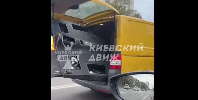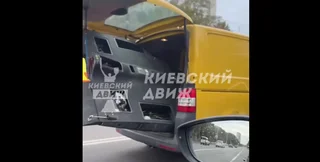 В Киеве очевидцы заметили желтый микроавтобус, из-задних дверей которого торчал корпус российского ударного беспилотника "Шахед".