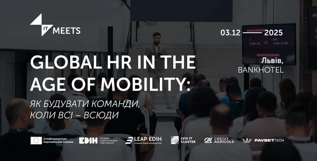 IT Meets. Global HR in the Age of Mobility, мероприятии, которое организует Львовский ІТ Кластер, поговорим о том, как аналитика, технологии и культура взаимодействия помогают создавать устойчивые международные команды. На событие соберутся ведущие эксперты по управлению талантами, которые поделятся практическими кейсами, обозначат ключевые тенденции 2025 года в сфере найма, развития и релокации специалистов.