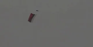 Как видно на кадрах, fpv-дрон пролетел некоторое время, после чего, судя по всему, пропеллеры зацепили шнур, на котором держалось полотнище, и беспилотник вместе с флагом начал падать.
