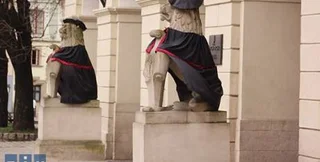 Ко Дню студента, львов, охраняющих вход во Львовский городской совет, одели в черно-малиновые мантии