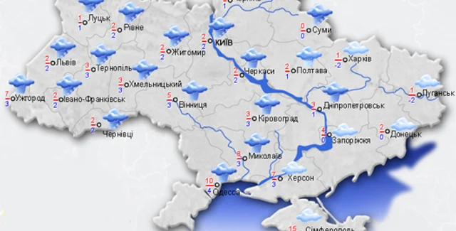 На западе Украины также дождь, мокрый снег и гололедица, ветер юго-восточный, 5-10 м/с. Температура воздуха ночью -3..+2, днем -3..+2.