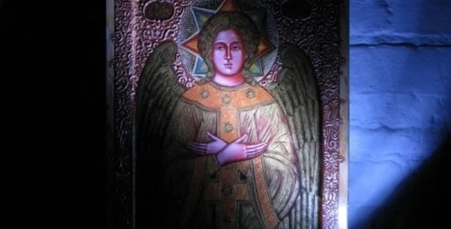 Идейным центром экспозиции есть икона-тондо (круг) "Христос - Ангел Большого Совета" - Христос с крыльями в круге Света с распростертыми объятиями.