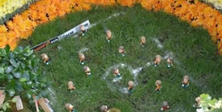Более того, макет снабжен натуральным газоном, на котором расставлены фигурки футболистов. Одна из команд – в узнаваемых оранжевых футболках. Вокруг поля расставлены рекламные щиты с названиями фирм-спонсоров "Шахтера". Имеются даже осветительные приборы, которые придают цветочной композиции совершенно фантастический вид.