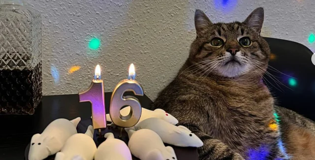 "Друзья, мне сегодня 16 лет — я именинник! Принимаю поздравления, комплименты и, конечно, вкусности. Мама обещала торт со свечами, поэтому жду, когда это чудо произойдет. Планы на день простые: есть, спать, ловить взгляды восхищения и снова есть. Ну и, возможно, поцарапать диван для праздничного настроения. Напишите в комментариях, какой я красивый, пушистый и самый лучший!" — "отметил" Степан, показав свои архивные фото.