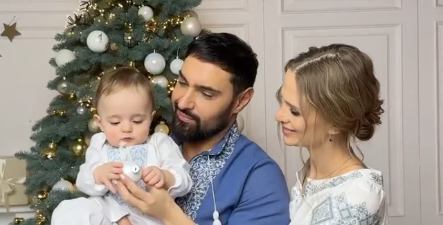 Виталий, его жена Юлия Бакуменко и их первенец нарядились в вышиванки. Семья попозировала возле украшенной елки накануне новогодних праздников.