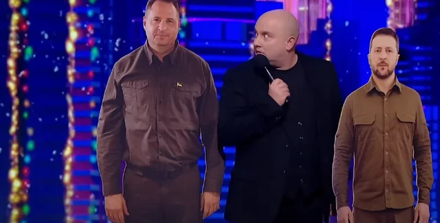 "Студия Квартал 95" выпустила традиционный рождественско-новогодний выпуск, где во время одного из скетчей участники шоу, разливая шампанское, с грустью вспоминают Владимира Зеленского, который, по их словам, уже давно не посещал их концерты. Чтобы утешить друзей, актер Евгений Кошевой вынес на сцену ростовую фигуру главы государства.