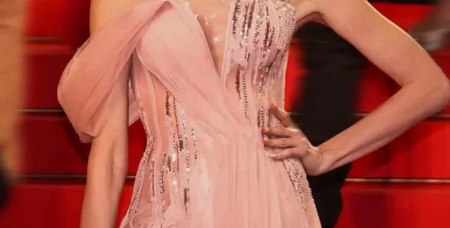 И уже через пару секунд она предстает перед поклонниками в роскошном пудрово-розовом платье мини-платье с шифоновой отделкой, которая спускается в пол, украшенном пайетками, элегантных босоножках и с клатчем в руках. Образ дополнен комплектом украшений.