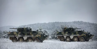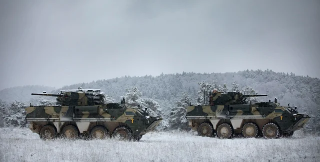 Отметим, что на учениях впервые принимает участие БТР-4Е. Всего их отправили 10 единиц вместе с ремонтной БРЕМ-4РМ и санитарно-эвакуационной машиной БММ.