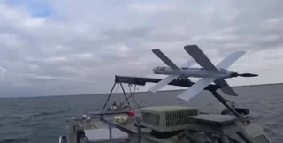 На видео видно, что дрон-камикадзе запускают в воздух при помощи механической катапульты с борта скоростного штурмового катера. Также издание показало запуск с катера дрона Zala, который после проведения миссии садится на сушу.