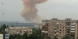 Над городом поднялся огромный столб рыжего дыма, а глава Луганской ОВА Сергей Гайдай призвал жителей региона не выходить из укрытий и подготовить маски для лица, пропитанные содовым раствором.