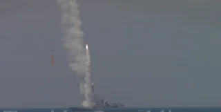 Фрегат российского флота запустил четыре крылатые ракеты "Калибр", одна из которых упала рядом с судном в море.