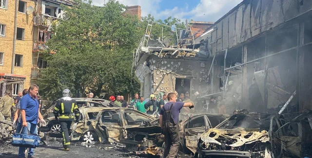 По данным Государственной службы по чрезвычайным ситуациям, попадание по парковке неподалеку от девятиэтажного Дома быта "Юбилейный" в областном центре произошло в 10:50. Известно о 25 сгоревших в результате удара автомобилях.