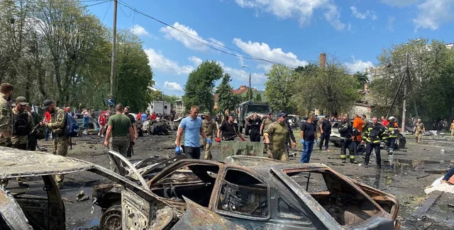 По данным Государственной службы по чрезвычайным ситуациям, попадание по парковке неподалеку от девятиэтажного Дома быта "Юбилейный" в областном центре произошло в 10:50. Известно о 25 сгоревших в результате удара автомобилях.