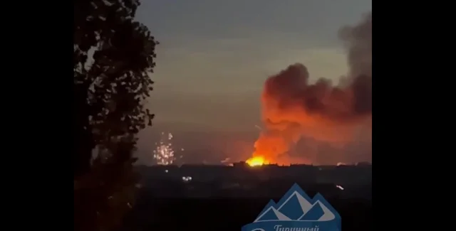 В телеграм-каналах публиковали видео пожара в оккупированной Кадиевке. Российские СМИ сразу начали утверждать, что склад загорелся после удара РСЗО HIMARS. На видеозаписях видно, как сдетонировавшие снаряды разлетаются вокруг. Кроме этого, на кадрах есть видны и зажигательные снаряды, которые в небе схожи с салютом.