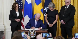 На церемонии подписания протоколов о присоединении к НАТО присутствовали президент Байден, вице-президент Камала Харрис, чрезвычайный и полномочный посол Финляндии в США и посол Швеции в США Карин Олофсдоттер.