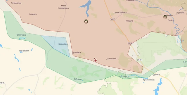 Село Бражковка в Харьковской области, которое находится на Славянском направлении боевых действий, вероятно уже под контролем ВСУ. Такой вывод можно сделать из карты боевых действий, которую составляет мониторинговая группа DeepState.