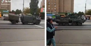 По городу проехала колонна войск РФ, которую засняли местные жители. Среди обычных грузовиков были замечены два необычных "экспоната". На броневик "Тигр" и БТР установили элементы динамической защиты "Контакт". Под весом подвеска броневика значительно просела — элементы ДЗ установили на весь борт машины, включая двери.