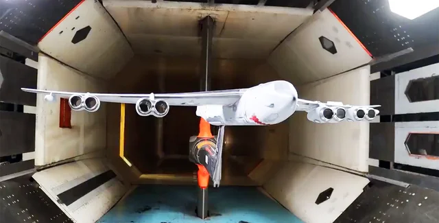 В ролике показали модель В-52 в масштабе 4% от реального. Ее установили в трансвузковую аэродинамическую трубу, где имитировали максимальную скорость около 1120 км/ч. В общей сложности самолет получит 8 новых двигателей.