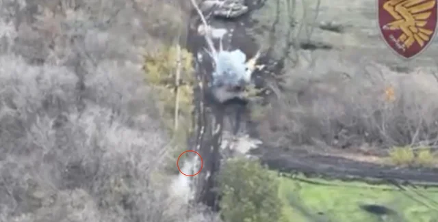 На видео видно как десантник устроил засаду на российский танк. В начале он дает ему проехать, а затем боец выбегает из леса и подрывает машину из гранатомета. После удара танк еще продолжает движение, но затем происходит второй взрыв и бронетехника становится недееспособной. Все это было записано с украинского беспилотника.