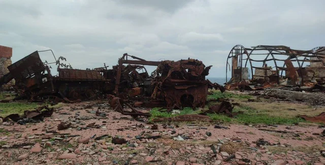 Постройки на острове Змеиный в основном разрушены, много уничтоженной российской техники. Об этом сообщил корреспондент проекта "Донбасс.Реалии", который посетил освобожденный летом остров и сделал там фотографии.
