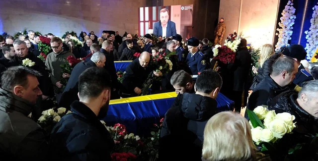 На экранах в помещении демонстрировали видеоролики о министре Денисе Монастырском и других погибших. Гробы установили на постаментах, после чего накрыли государственными флагами, а рядом на подушках положили государственные награды и цветы.