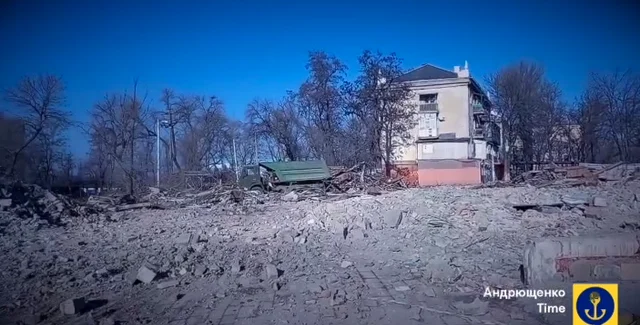 По словам Андрющенко, центр Мариуполя сейчас превращается в лунную пустыню со скелетами многоквартирных домов, горами строительного мусора и кратерами оголенных фундаментов.