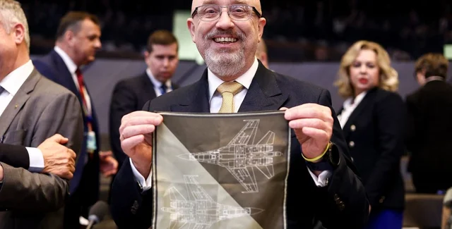Накануне заседания в формате "Рамштайн" министр обороны Алексей Резников в Брюсселе демонстрирует журналистам платочек с изображениями самолетов: "Видите, что это?" – спрашивает Резников. "Истребители. А откуда вы их планируете достать?" – раздается вопрос. "С неба", – министр указывает пальцем вверх.