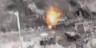 На кадрах видно горящий Т-90М "Прорыв". Автор ролика также иронизирует, что "аналогов у танка нет". Установить, что в видеоролике именно Т-90М можно по специфической башне машины и боковому набору динамической защиты "Реликт".