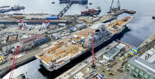 В РФ построили специальный сухой док СРЗ №35 в мае 2022 года, чтобы ремонтировать авианосец. Работы по его восстановлению длятся уже несколько лет. На этом пути корабль постоянно переживает различные происшествия. В 2018 году крупнейший плавучий док ПД-50 затонул. Также он неоднократно горел.
