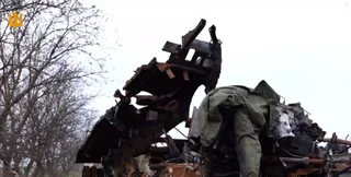 Один из артиллеристов показывает результаты работы их расчета в одном из населенных пунктов, где какое-то время размещались оккупанты, и где они потеряли свою технику.