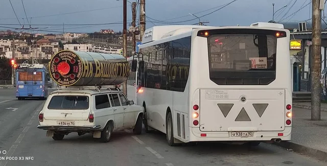В оккупированном Крыму произошло ДТП с участием легковушки и пассажирского автобуса. Оно осталось бы незамеченным, если бы не старенькая "Волга" — участница дорожно-транспортного происшествия с ракетой на крыше. Кадры выложили в сети, передает Фокус