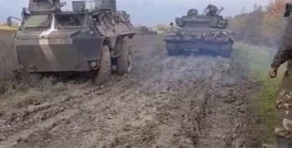 На видео можно увидеть, что БТР оказался на обочине и не может сдвинуться с места. В помощь иностранной технике пришли украинские танкисты. Они с помощью танка и вытащили французский бронетранспортер.
