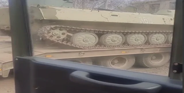 На видеокадрах виден МТ-ЛБ — многоцелевой плавающий бронетранспортер, который создан для транспортировки людей и грузов, а также широко используется в роли артиллерийского тягача. На него зачем-то установили корабельную установку 2-УК-Т с 12,7-мм пулеметами ДШК.