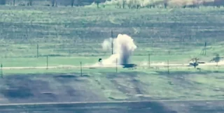 На видео можно увидеть, как РСЗО была уничтожена одним метким выстрелом. Также в сторону отбегает несколько оккупантов.