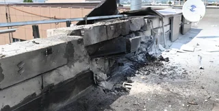 На них видно, что беспилотный летальный аппарат разлетелся на мелкие куски. Его детали в результате пожара обуглились. Также можно заметить, что БПЛА повредил железобетонный бортик, который служит защитным ограждением на крыше здания, и "тарелку" спутникового телевидения.