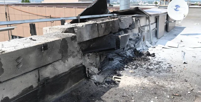 Беспилотный летальный аппарат врезался в крышу одного из офисных зданий. Взрывчатка внутри него не сдетонировала, но сам ударный дрон загорелся.