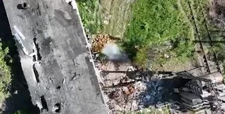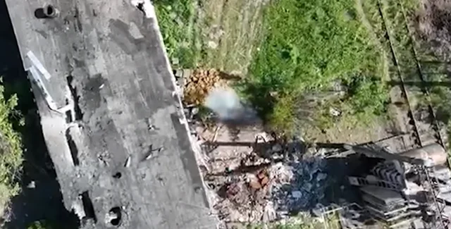 Сначала на кадрах видно, как беспилотник сбросил снаряд на склад российских военных.