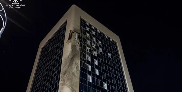 По информации Главного управления ГСЧС Украины в Киеве, в Соломенском районе был поврежден фасад административного здания с 9 по 11 этажи в результате падения обломков.