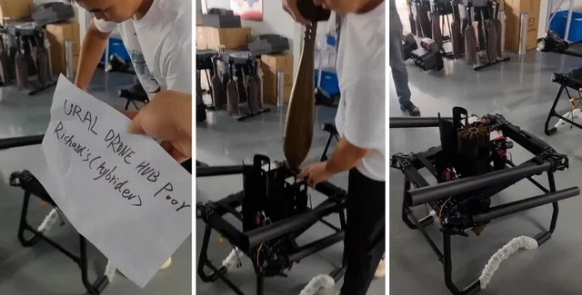 На видео мужчина демонстрирует технику, которая предназначен для сброса мин. В специальные контейнеры (их у устройства два), загружаются боеприпасы, а после этого дрон взлетит с этим креплением в воздух и будет атаковать минами цели. В кадре также на несколько секунд появляется листок бумаги, на котором написано название компании-заказчика — Ural Drone Hub. Это компания, которая занимается вопросами закупки, поставки, а также сбора беспилотных летальных аппаратов в России.