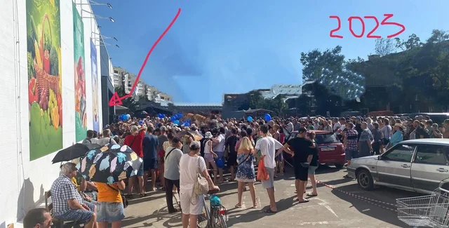 Теперь же, в 2023 году жители города в 40 градусов жары пришли постоять в огромной очереди возле супермаркета, в надежде получить что-то бесплатно из еды, что свидетельствует о проблемах с гуманитарной помощью.